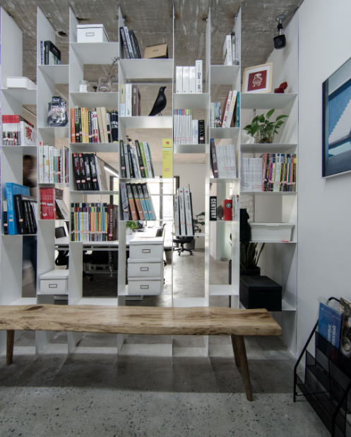 2、書架用金屬材料連著天花板,又能起隔斷作用,還能放裝飾品和書籍,簡(jiǎn)單又實(shí)用。