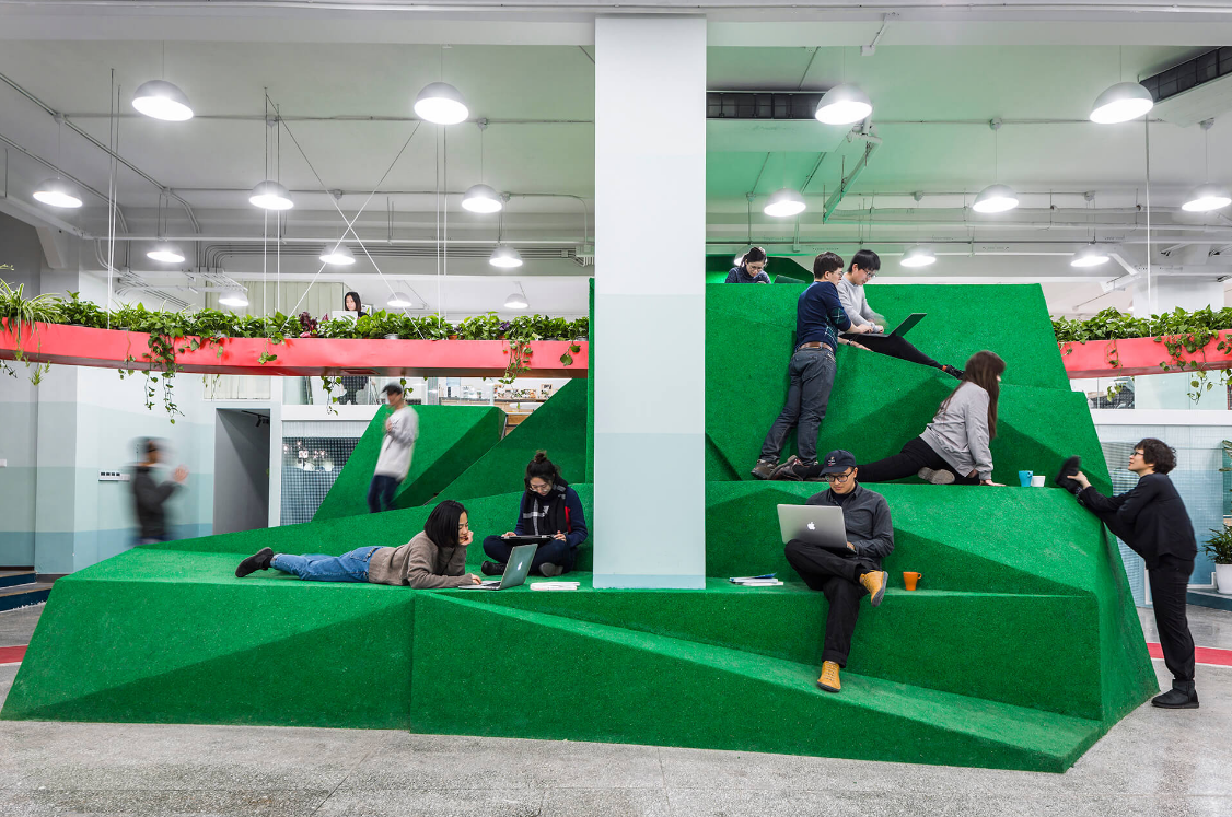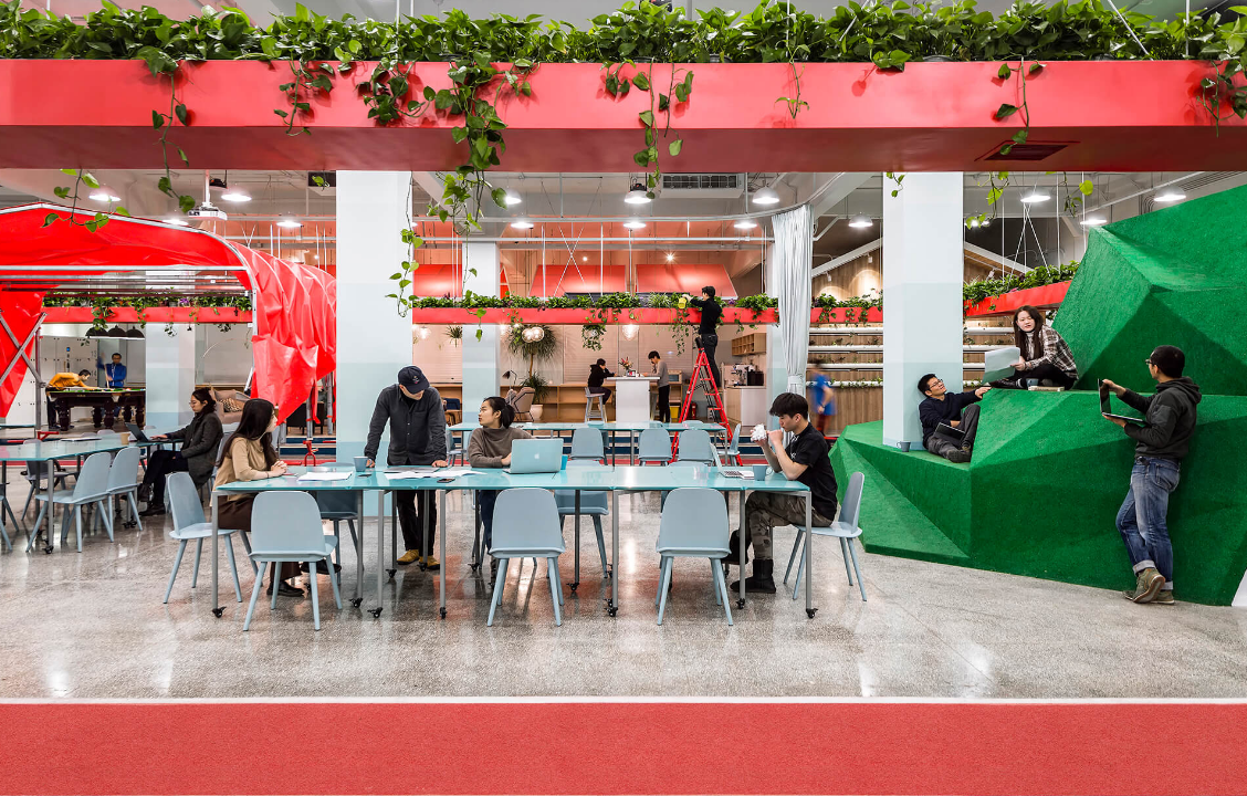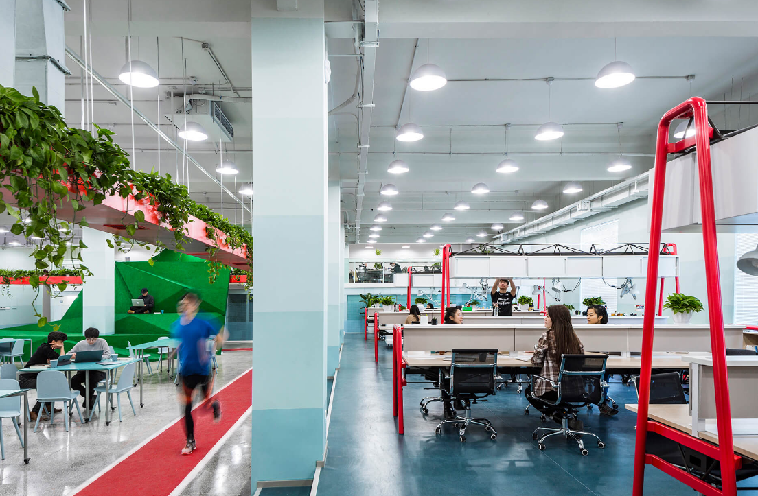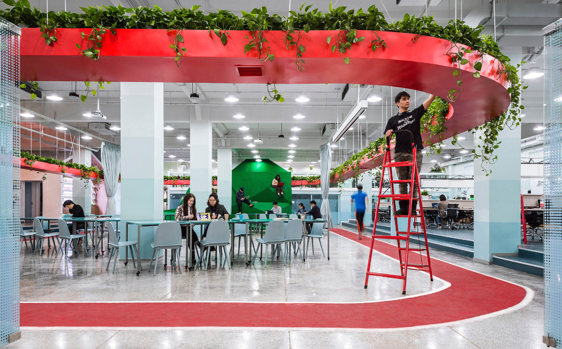 辦公室裝修設(shè)計(jì)上,用一個(gè)中間懸掛的“紅環(huán)”聯(lián)系在一起,紅環(huán)上種植蔬菜與植物,下面對(duì)應(yīng)的是跑道。員工在跑道健步的同時(shí)可以打電話,也可以與照料植物的同事進(jìn)行交談。