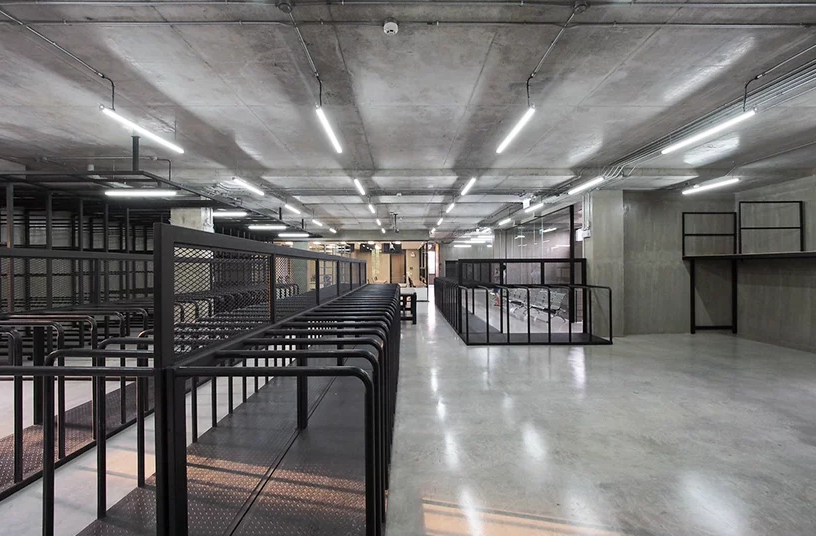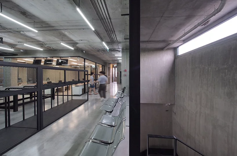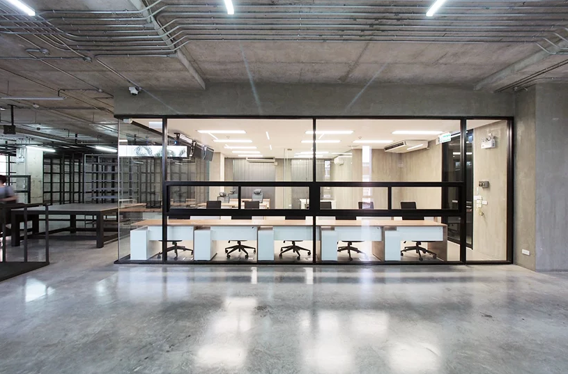 二樓辦公室裝修中充當(dāng)皮革展示區(qū)和辦公空間。每層的窗戶隔片都是可以旋轉(zhuǎn)的,而且窗戶是凹進(jìn)去的,這樣帶來(lái)的是間接的光線,不會(huì)損傷皮革制品。辦公區(qū)和展示區(qū)都是很寬大的,整體有著很濃的工業(yè)風(fēng)格。