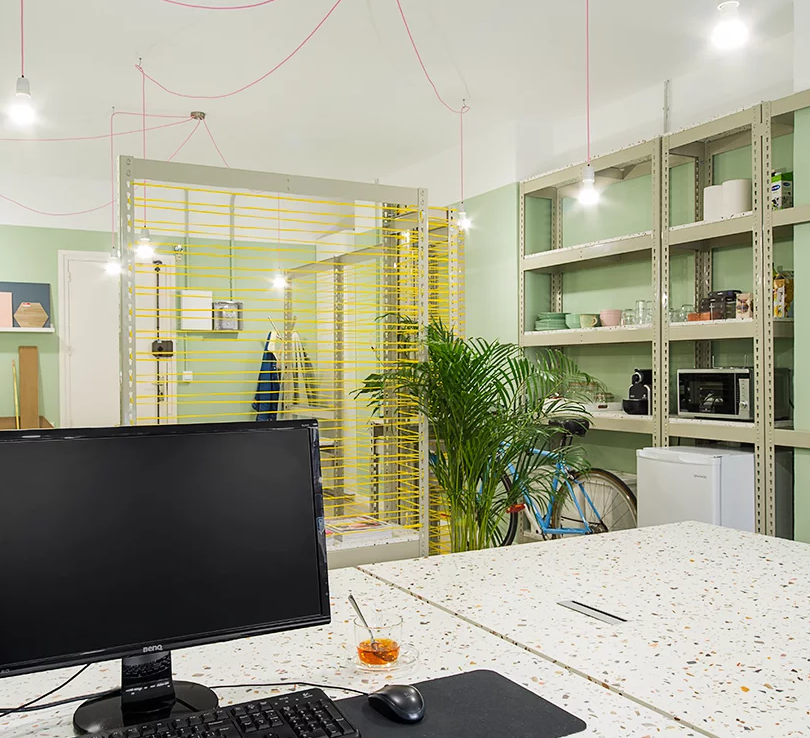 該工作室分為兩個區(qū)域:與入口接觸的會議室,以及位于房間后面并與自然光入口接觸的工作區(qū)。將這兩個區(qū)域分開,有一個鋼結(jié)構(gòu)和紡織品穿插的分隔框,覆蓋了整個區(qū)域。辦公室的室內(nèi)裝修采用了很多水磨石來裝飾,包括桌面,置物臺,前臺等等