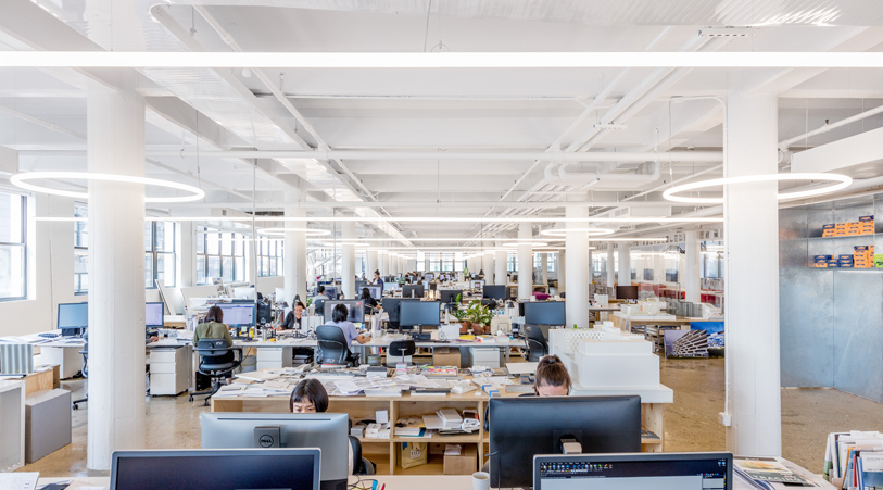 由于振興后的工業(yè)區(qū)位于紐約東河沿岸,開放式辦公室裝修的連續(xù)玻璃窗提供了毗鄰曼哈頓天際線的全景。這間辦公室是由BIG的內(nèi)部團隊設(shè)計和規(guī)劃的,其特點是重復(fù)的元素,為整個開闊的空間提供了連貫的連續(xù)性。