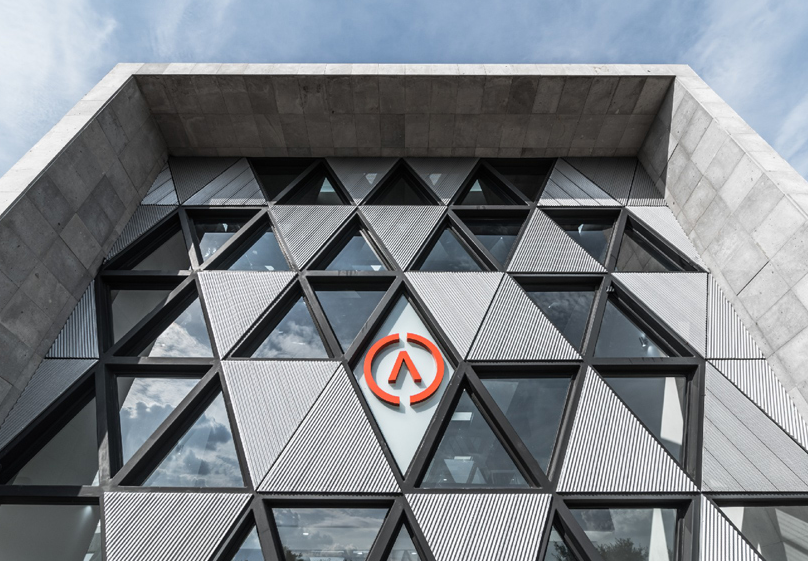 為了與綠樹成蔭的溪流建立聯(lián)系,從公司的大堂就營(yíng)造了視覺效果。同時(shí),延伸到建筑外部的外部露臺(tái)。外主立面設(shè)計(jì)為三角形圖案,以公司的企業(yè)形象為參照,具有象征性和獨(dú)特性,圖案的基本模塊對(duì)應(yīng)于組織標(biāo)識(shí)的同型,該標(biāo)識(shí)包含在立面的中心部分。