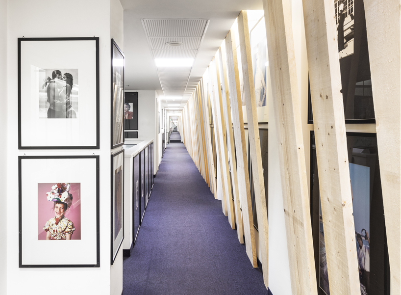 下面一個(gè)辦公室裝修是由,一長(zhǎng)串樹脂木板以不均勻的間隔排列,它們靠在墻上,沿著過(guò)道延伸,就像人類的脊柱一樣,連接著一切。而這種辦公室裝修的一條狹長(zhǎng)隧道,其中一面充滿了時(shí)尚歷史的圖像,被強(qiáng)烈的照亮。
