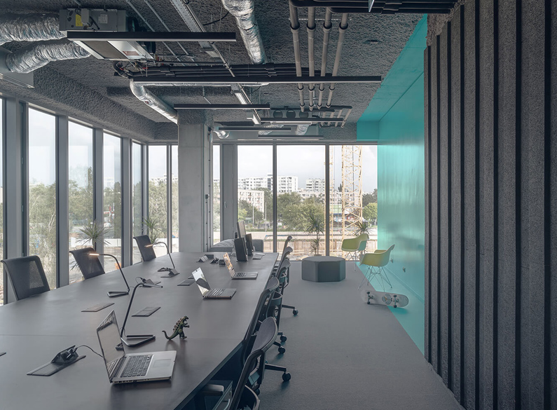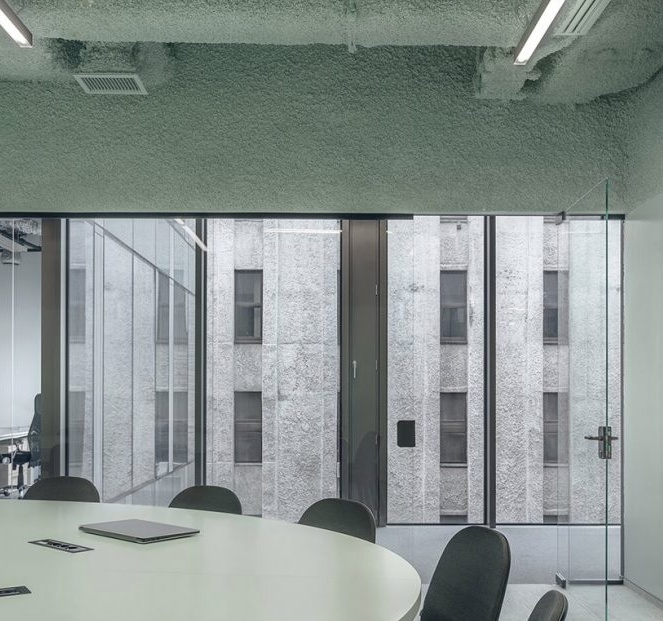 辦公室裝修采用的噴霧泡沫天花板和聲學(xué)面板墻被用來(lái)減輕聲音的傳輸和保持聲學(xué)的舒適性。而不是解決這與一般的聲學(xué)天花板瓷磚或擋板,聲學(xué)處理被整合為空間室內(nèi)設(shè)計(jì)的一部分。辦公室裝修的隔音墻板采用條紋浮雕圖案,為內(nèi)墻飾面提供尺度和節(jié)奏感,而辦公室裝修的天花板則采用整體方式,在某些情況下覆蓋所有機(jī)械設(shè)備,將它們變成懸掛的抽象物體,通常會(huì)被通用下降的天花板系統(tǒng)所掩蓋。