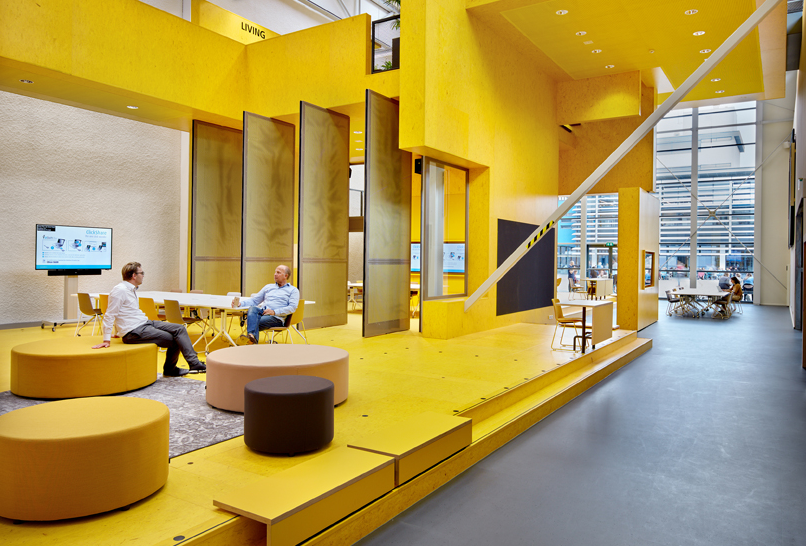 最后的辦公室裝修設計靈感來自于建筑實驗家和藝術家的一件黃色的3D小藝術品??死锝?middot;德科寧,將大禮堂內現有的四個不同樓層連接起來,為工作提供各種解決方案。