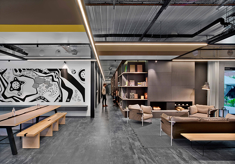 辦公室裝修的空間是模塊化的:健身房變成了一個與眾不同的頭腦風暴室,里面有腳凳座椅。辦公室裝修特定的地方被預留給高度連接、會議、測試、電話會議或注意力集中的時刻,就像在材料庫中一樣。工作站位于兩層樓的兩張大開放式辦公桌上,可促進共享、流動性、機動性和創(chuàng)造性。辦公室裝修中兩個綠色的大露臺提供不同的工作場所,見面或呼吸。該計劃平衡了冷暖地帶,使室內開放給戶外。他們允許模塊化空間,以一種露營的方式。橫向和縱向的聯(lián)系使人們的循環(huán)更加流動,以刺激交流和接觸。