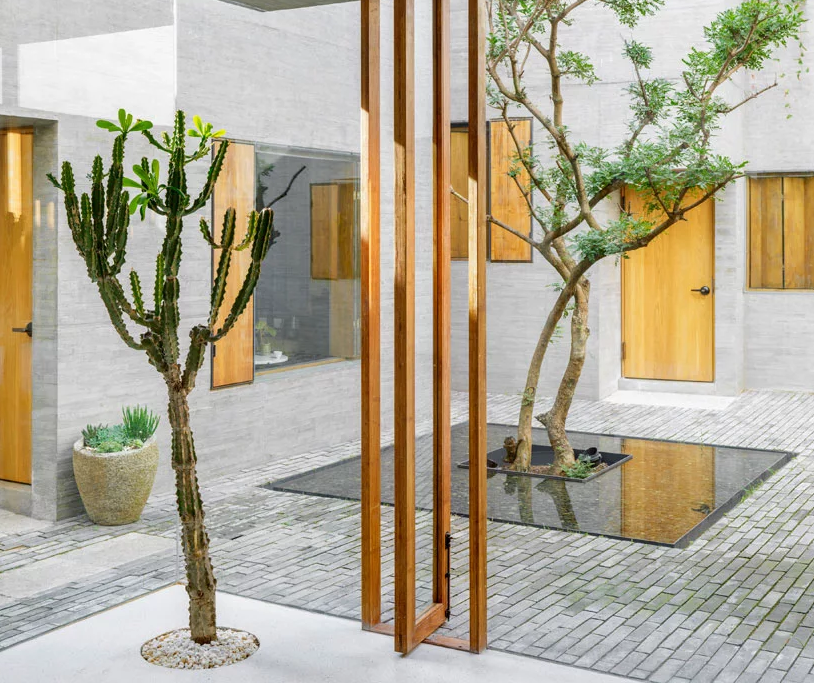 庭院經(jīng)常有一天中某些時間太暗的缺陷; 然而,sunyata酒店沒有這個問題。朝陽建筑師設計了一個允許光線和視覺透明度的方案,使庭院成為一個開放的空間,光線投射到各個角落,陰影和陽光混合在一個舒緩的陰陽之中。玻璃飛機是如此專業(yè)地安裝,即使是人類也會懷疑它們的存在/知道空間的起點和終點。