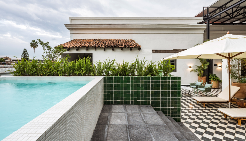 酒店裝修翻新的屋頂露臺(tái),同時(shí)擁有一個(gè)酒吧與蔚藍(lán)家具和戶外游泳池與Tlaquepaque的著名教堂穹頂?shù)那熬啊?/div>
